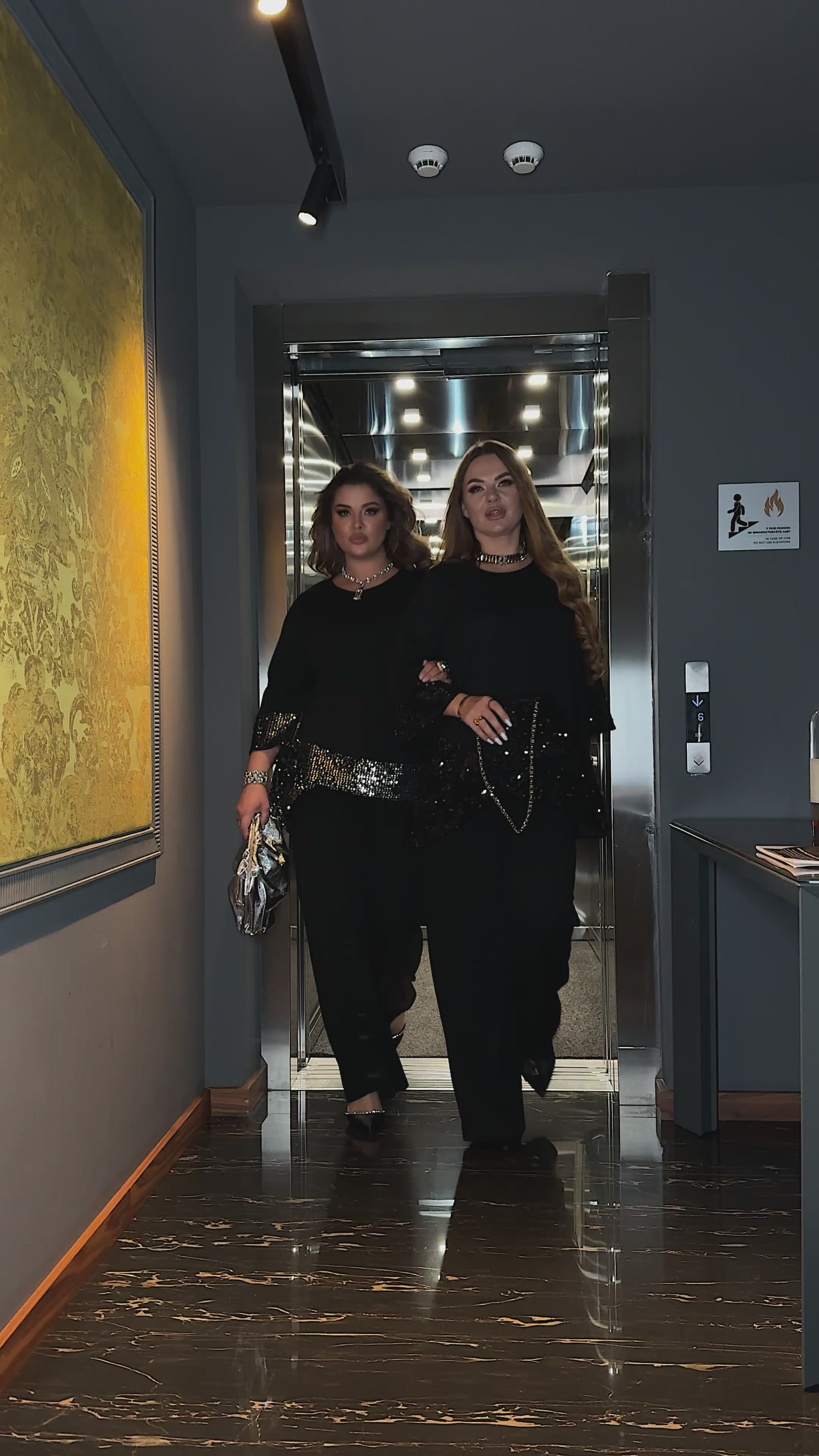 This stunning two-piece trouser suit is the perfect choice for festive occasions and elegant evening events. The set features a uniquely cut tunic with an asymmetrical hemline that adds a modern and dynamic touch to the silhouette. Crafted from premium crepe-diving fabric combined with high-quality sequins on a velour base, it offers both luxury and comfort. The trousers are designed with a flexible elastic waistband and functional pockets for a practical yet sophisticated fit. Shimmering sequin panels on the cuffs and hem create a beautiful play of light, ensuring you stand out at any celebration. Specifically tailored for plus-size proportions, the loose fit provides a flattering drape and absolute freedom of movement. Elevate your holiday wardrobe with this trend-setting ensemble that balances contemporary style with classic elegance.
