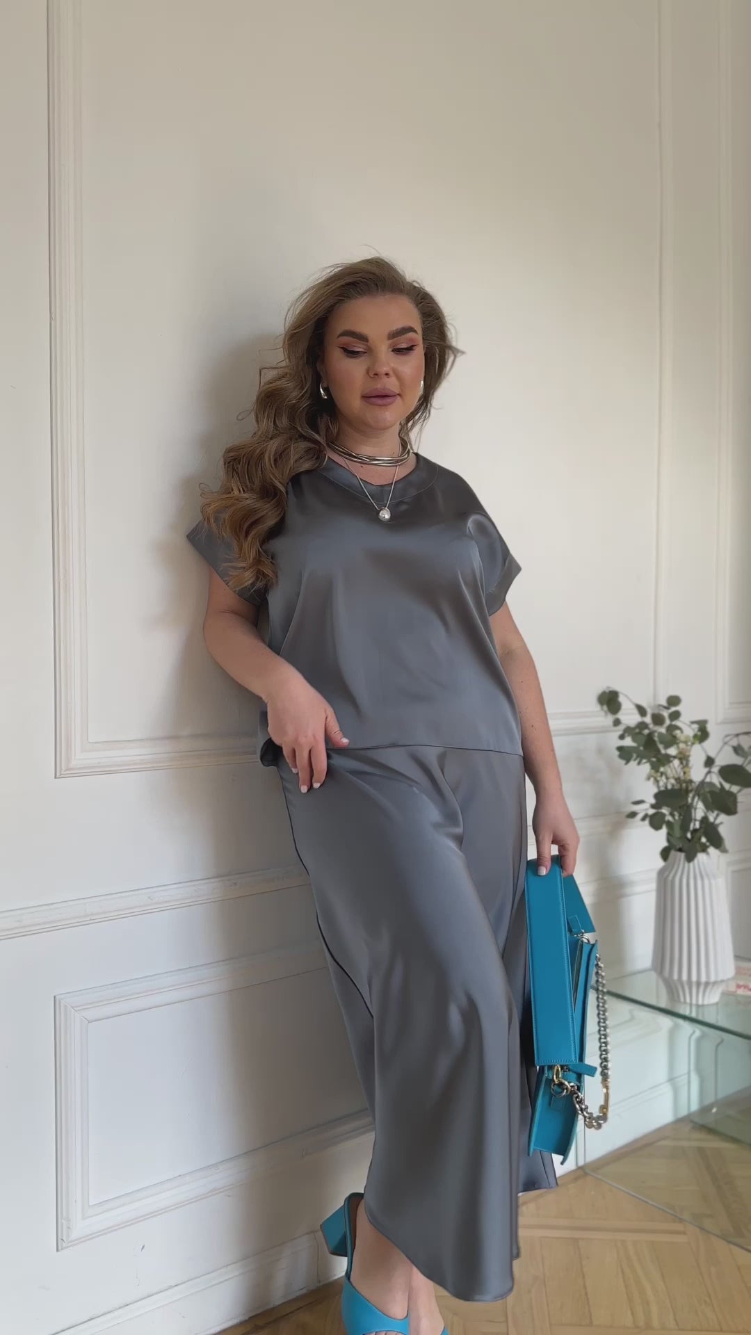 Ця спідниця втілює позачасову жіночність завдяки витонченій довжині міді та вишуканому атласному блиску. Стрункий, приталений силует елегантно облягає тіло, переходячи в м'який А-силует від стегон. Розкішна костюмна атласна тканина забезпечує гладку, блискучу обробку та міцне, якісне відчуття на дотик. Розроблена для фігур plus-size, висока еластична талія забезпечує як привабливу посадку, так і винятковий комфорт для цілоденного носіння. Її універсальна елегантність робить її ідеальною для офіційних заходів, офісного одягу або вишуканих вихідних. Міцна конструкція та високоякісний матеріал гарантують, що цей виріб збереже свою форму та красу протягом багатьох сезонів. У комплекті з відповідним шовковим шарфом це ретельно підібраний ансамбль, який миттєво підкреслить будь-який образ.